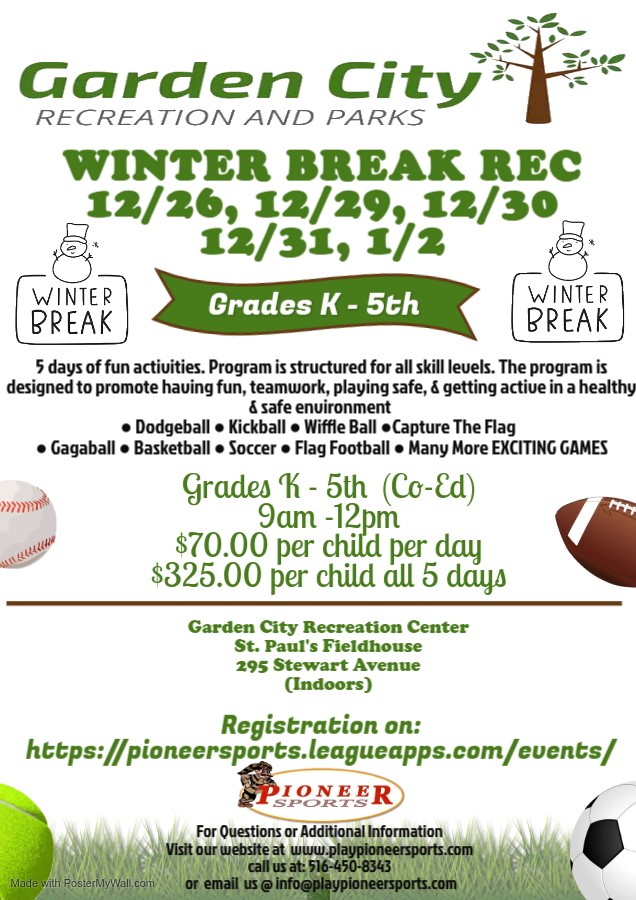 Follow our new Instagram and Facebook “GardenCityRecreation” for all Recreation content! Any questions regarding programs or facilities can be directed to our new Recreation email, GCRec@gardencityny.net .