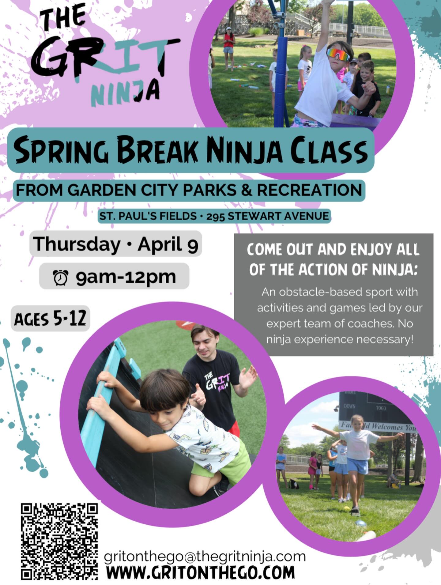 Join The Grit Ninja for an action-packed morning of obstacles, games, and ninja challenges at St. Paul’s Fields in Garden City!